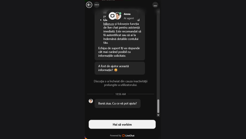 | Live chat cu agent uman | zilnic 10:00–22:00 | clarificări care cer intervenție umană, întrebări mai tehnice sau situații specifice |