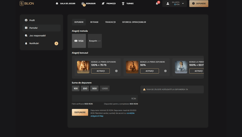 După ce am explorat jocurile și promoțiile, am analizat secțiunea administrativă, unde regulile clare sunt mai importante decât designul platformei. La Bilion.ro, procesul de alimentare a contului și cel de retragere a câștigurilor esteintuitiv.